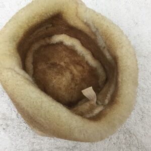 I love the marbled coloring on this hat! Can leave flaps down to keep ears toasty warm, or tie the sides up with the leather tie. Awesome Trapper Hat, so perfect for winter weather. Has a few small imperfections on back of hat but not bad. Made in Idaho.