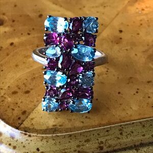 This pretty statement piece features 11.40 ctw. of genuine, earth mined sky blue topaz (heated) and natural white zircon. The blue topaz has a very unique, honeycomb cut, making the ring have lots of sparkle. The center gemstone measures 16x12mm. The ring is set in solid .925 sterling silver with a rhodium plate to prevent tarnishing. The ring in the photos is the actual one you will receive, so please see photos for quality and measurements. Size 7.