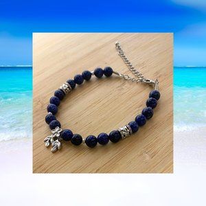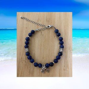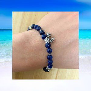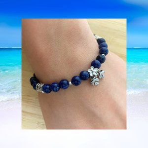This handmade bracelet is made with genuine sodalite and a silver flower charm. The bracelet has an adjustor, so you can adjust how the bracelet fits on your wrist.