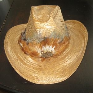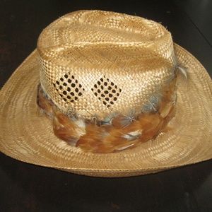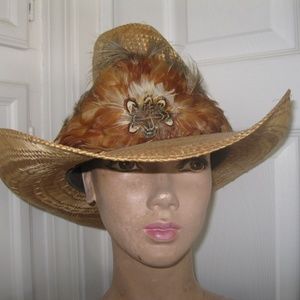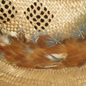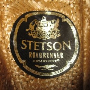 Genuine Stetson "Roadrunner" had with stunning feather band; excellent condition, straw-color, OS Length & Width: 16" X 12" Inside measurements: 8" X 7" Note: could be worn by adult male or female, not for a "tin" head