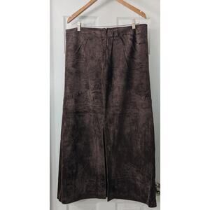 Genuine Suede skirt. August Silk Logic. Chocolate brown. Fully lined. Stitching detail. Back slit. Back zipper closure. Size 14. Measurements laying flat: 18 inch waist, 38 inch length, 17 inch bottom hem slit. Vintage.