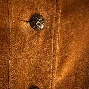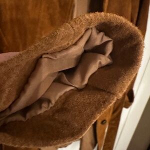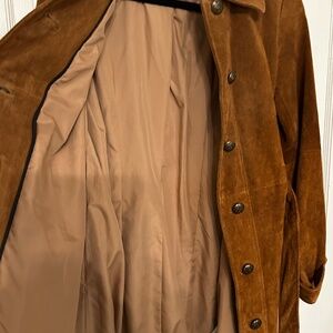 Suede trench coat featuring belted waist and side/pockets. Fully lined throughout body and long sleeves. Pockets are also lined.