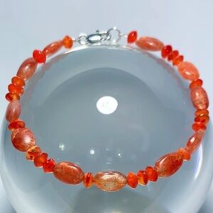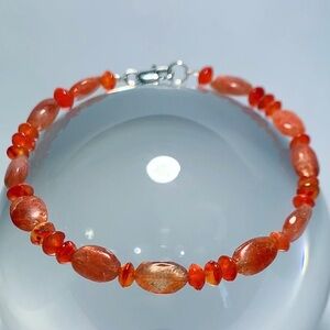 Healing Sunstone & Carnelian Gemstone Bracelet! Some say that Carnelian is believed to help those who are timid when it comes to speaking up & helps those to speak eloquently and bold. Carnelian was worn around the neck of Ancient Warriors for courage & physical power to defeat their enemies. It was worn by master architects in Egypt for rank of leadership in building. shape/size vary. (Bundle & Save with Discount!)