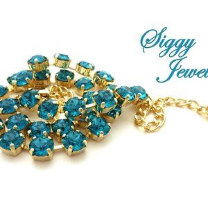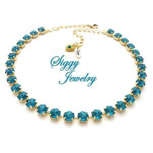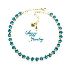 This beautiful and sparkly Swarovski crystal jewelry set consists of a 30 stone tennis necklace, 13 stone bracelet and 8mm drop lever back earrings in indicolite, a gorgeous teal blue color.