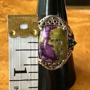 If you are looking for a unique statement piece, this one may be what you are looking for. The ring is made with an earth mined Tasmanian Stichtite and chrome diopside. The stichtite stone measures about 15x11mm. The ring is set in solid .925 sterling silver with yellow gold vermeil accents. This piece comes from a quality designer, STS, and it is a very nice ring that should last for years. The ring in the photos is the actual one you will receive, so please see photos for gemstone quality and measurements. Size 9. Excellent vintage condition.