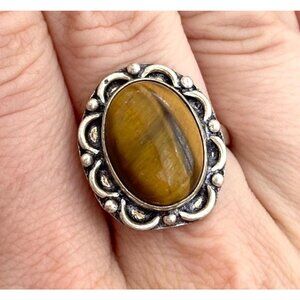 Lovely genuine tiger's eye vintage gemstone ring. The stone is oval shaped and bezel set. Surrounding the stone is a scalloped design with beads in between scalloped sections. Marked as 925 and tested positive as such via chemical testing.
