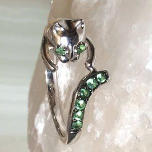 Genuine Tsavorite is a natural green Garnet! Tsavorite gems are set in Sterling Silver to form the eyes & tail of this fun and unusual wrap-around cat ring. This is a Limited Edition piece of Fine Jewelry & the gemstones are ethically sourced. Great gift for cat lovers of any age! Boutique item, imported from the UK.