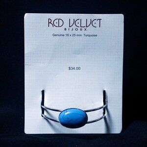 Genuine 18 X 25 MM Cabochon Stone in a silver-tone bezel setting. The cuff is open and can be adjusted for size. Manufacturer: Red Velvet Bijoux. MFSR: $34