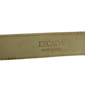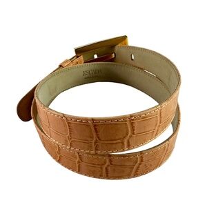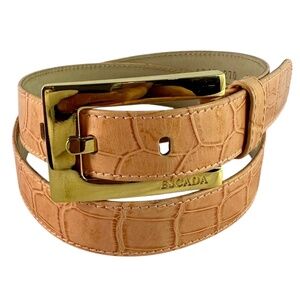 You are looking at a genuine belt by Escada made of leather with lovely croc pattern. Belt is size 30 US and measures 35"8 long and 1" wide and measures 29" on the first perforation and 31" at its last perforation from buckle. This nice vintage Escada belt is adorned with gold tone hardware, light pink leather with croc pattern. The condition of this belt is very good and was well cared for. 100% genuine Escada made in Italy.