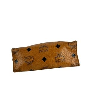The measurements are 6"8 wide, 4"5 tall, 2"5 deep with a top zipper closure. There is a beige vinyl lined main compartment and a top zipper closure. This genuine MCM bag is in good condition for its age with brass/gold tone hardware, strong leather trim with no tears and the bag looks amazing. The bag is clean and there are some minor ink scratches on the interior and the exterior is fine. Genuine MCM and the bag has been authenticated.