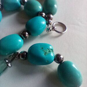 This is a beautiful necklace featuring what is known as "tumbled" turquoise beads. As you can see from the pictures, this is real stone, real turquoise. It is very heavy and icy to the touch. The color in the bead holes is all turquoise.
