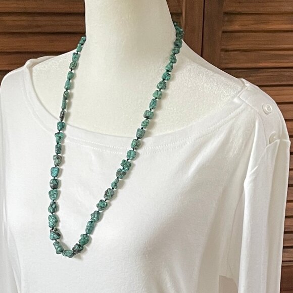 This beautiful, vintage necklace is made with genuine turquoise nuggets on a knotted closed loop cord. It measures 14 inches (14") in looped length. Each nugget is unique.