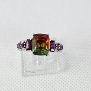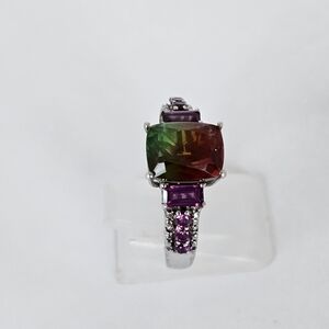 Photos can't capture the beauty of this ring. It is a designer ring made of solid sterling silver with platinum overlay, and all of the gemstones are genuine earth-mined. The center gemstone is watermelon quartz. The gemstones along the shank are genuine rhodolite garnets. A popular garnet, prized for its raspberry color. Stamped with maker's mark & 925. Size 8 ** Prices will fluctuate based on current mark values. Jewelry from QVC, HSN, JTV, Gemporia, Kay Jewelers, Shop LC, Shop HQ.