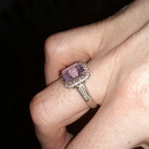 Beautiful 925 genuine amythst with accent diamonds. This ring is stunning! Genuine amethyst. 3 square diamonds on each side of band with accent diamonds all around.