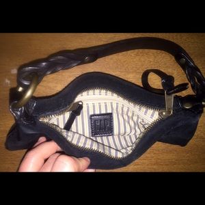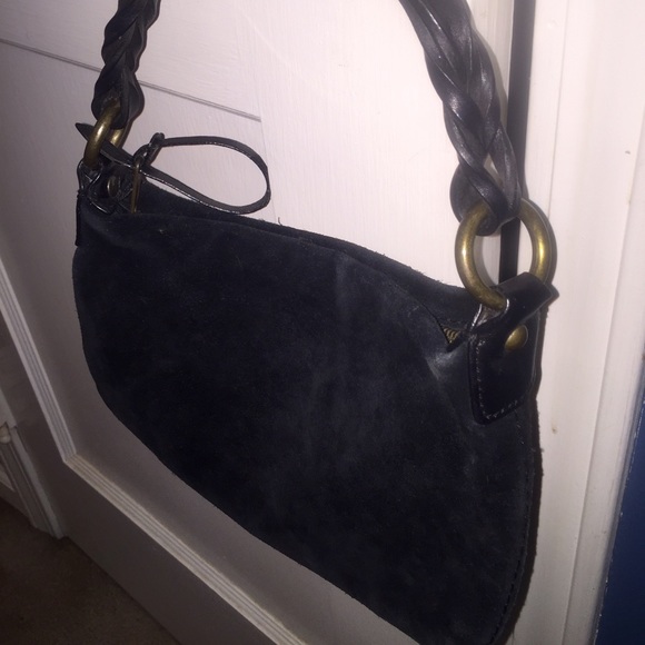 This bag is made of genuine black suede (and leather details). It zips at the top and had an interior zipped pocket as well. Great size and goes with casual and dressy outfits.