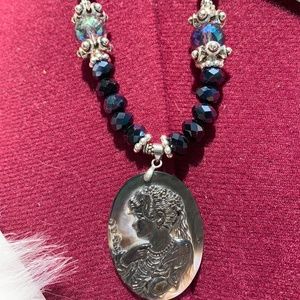 This 18" necklace has a hand-carved genuine abalone shell cameo for pendant. The necklace consists of silver crowned aqua faceted crystals, black crystal beads with silver-plated spacers and black pave rhinestone beads.