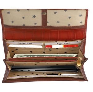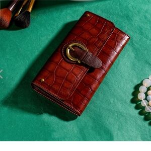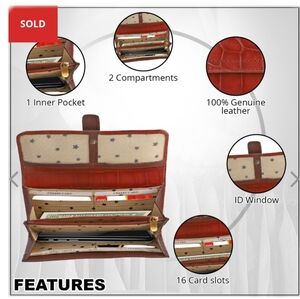 Genuine leather, Rust/caramel color with a crocodile design, snap closure, ID window, 16 credit card slots, inner zipper compartment. Pick up or shipping is available.