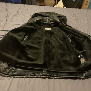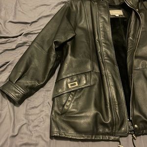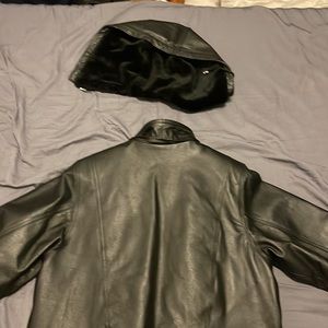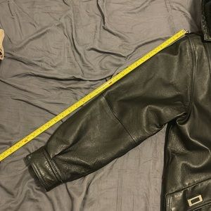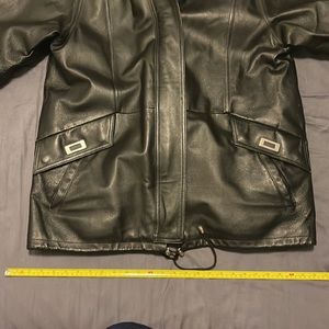 Real leather jacket size large but since it’s vintage the sleeves are shorter than jackets today. Detachable hood and detachable liner for different weather and temperatures. Put a measuring tape next to areas that you may need measurements for.