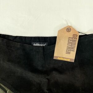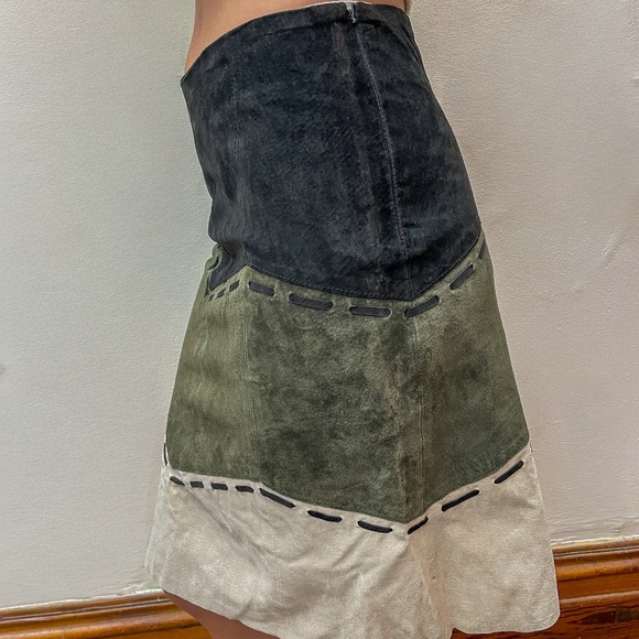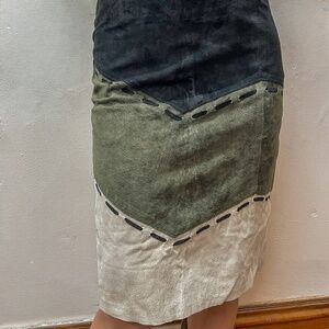 dollhouse genuine leather suede skirt. Color blocked suede with lacing detail between blocks. pencil skirt midi length.