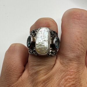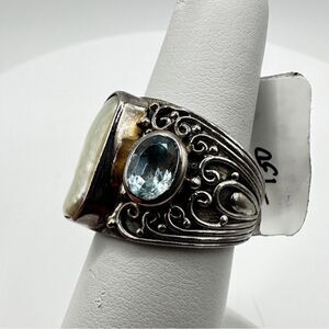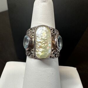 This is an incredible combination of stones! Beautiful pearl, measuring 17mm x 9mm and two accent blue topaz, oval cut, measuring 8mm x 6mm.