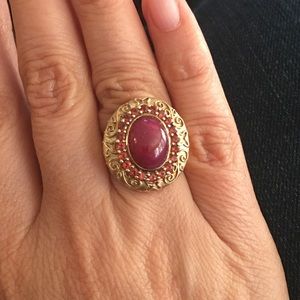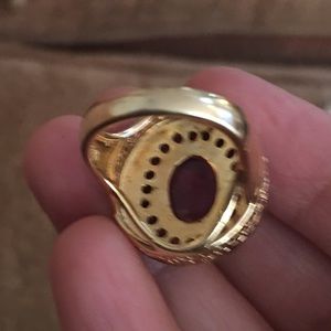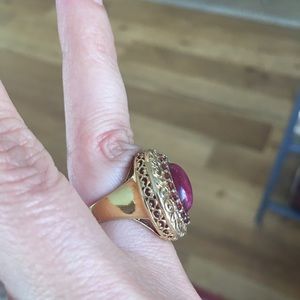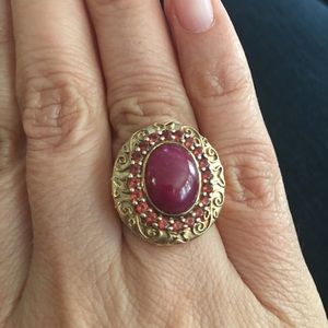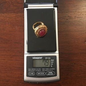 This is a beautiful ring by designer Samuelle & Co. It has a 100% genuine cabochon ruby at the center and 20 round cut orange garnets around it. The ring itself is made of sterling silver (stamped 925) with the 18K gold plating. It weighs 7.9 grams, is a size 5.0-5.25 and in excellent vintage condition.