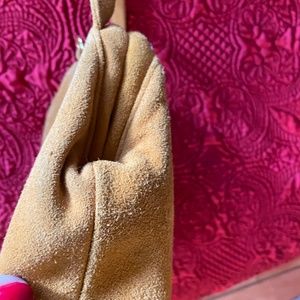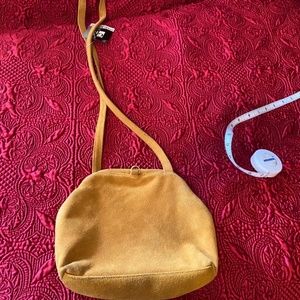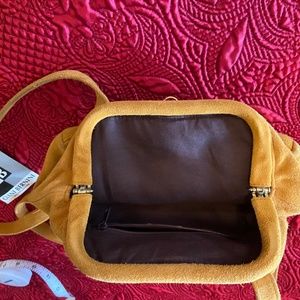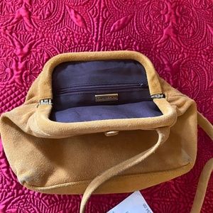 Tags still on the bag. Never used. Golden suede genuine leather Gianni Bernini cross body bag with hinge opening and lined with brown nylon. One zipper pocket inside and cute purse style.