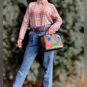 This unique handbag is handmade from distressed and color gradients genuine leather. Amazing beautiful embossed floral and and butterfly, high quality hand painted. This large size handbag can hold a lot, spacious enough for your phone, large wallet, books, cosmetics, compact umbrella, & other items that you may need.