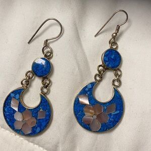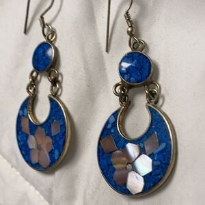 Genuine crushed blue lapis and mother of Pearl inlay set in alpaca silver drop earrings