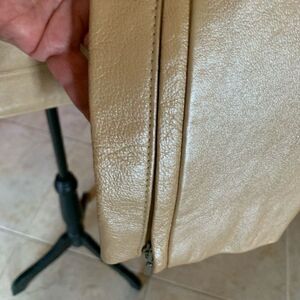 Beige/gold leather jacket with zip front closure & zip sleeves. 26” from shoulder to hem.