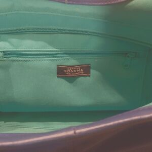 Genuine Sonoma Jean Company blue/turquoise canvas beach tote. Measures 16" W x 9" H x 6" D; 10" vinyl handles. Center zipper closure; outside zipper pocket, inside slip pocket & zipper pocket and 2 flap closure pockets for phone, glasses, etc. Very good pre-owned condition with no rips or tears. There is one stain on the inside (see last photo).