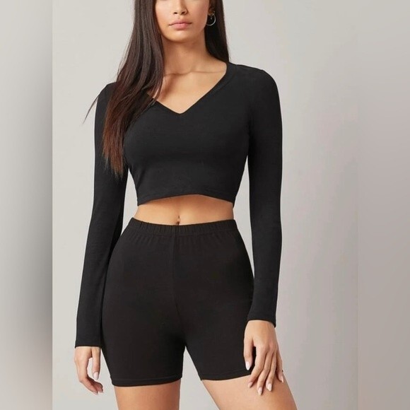 Very nice and comfortable Genx Clothing Women’s Long Sleeve V Neck Rib Knitted Black Crop Top, Size Small.
