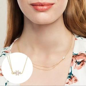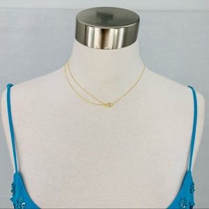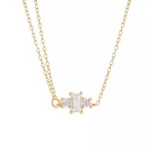 Asymmetrical gold necklace with 2 chains on one side and 1 chain on the other. Center crystals in between; an emerald cut crystal cz at the center with round czs on each side.