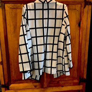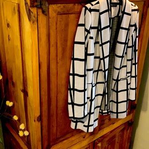 Geo pattern jacket is made of polyester rayon and spandex for easy comfort/travel. Grey base with black lined pattern. Questions let me know!