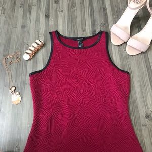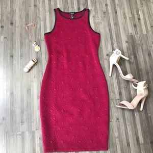 Burgundy colored, geo patterned, quilted bodycon midi dress, with black lining.