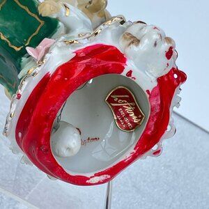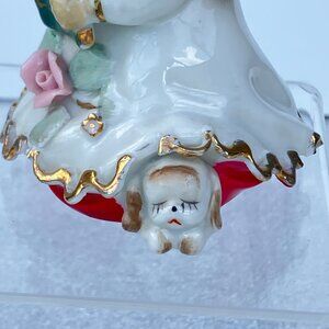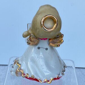 Vintage Geo Z Lefton Christmas Angel Choir Girl with Puppy Bell** Flawed - Sweet, chubby cheeked singing girl in pig tails, gold halo and wings, holding a music sheet and a cute little pup peeking out from under her dress. She has a white petticoat dress over a red hem, gold zig zag trim, bowtie and arm cuffs. On the front of her dress a red rose and green leaves. 4 1/4" high 3" wide. Flawed vintage condition. Nice color with some paint loss. Her beautiful gold zig-zag dress trim has chips and missing parts. Gold is strong where not chipped. Original paper sticker on the inside. **see all photos