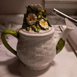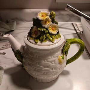 Geo. Z. Lefton Mid Century Rustic Yellow Daisy Basket Teapot. #3855. Adorable. Measures 8" tall and 9 1/2" wide from handle to spout. 2 Small chips on lid. See pics. Other wise in great condition. Perfect for spring and summer.