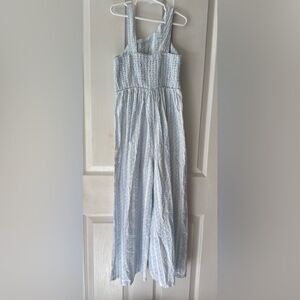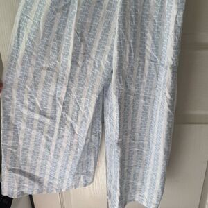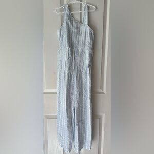 An abstract stripe patterns this linen-blend jumpsuit, cut in a one-shoulder body with wide legs. Pleating at the upper bodice completes the look.
