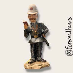 This Geo Z. Lefton hand-painted ceramic figurine depicts a traditional British policeman, or "bobby." Crafted in Japan, this vintage piece stands approximately 8 inches tall and is made of fine porcelain.