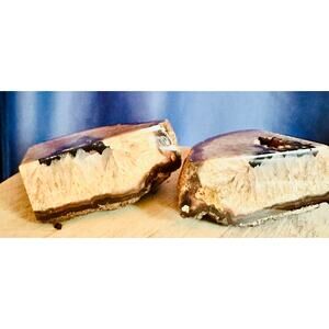 Geode bookends featuring polished interiors showcasing crystalline structures and natural, earthy tones. The exterior retains a rough, natural finish. Each piece stands approximately 4 inches tall and spans roughly 6 inches in width when placed together. The condition shows minor imperfections consistent with natural geological formation.