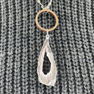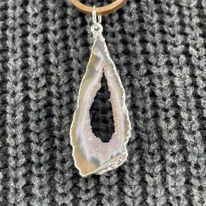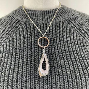 A slice of naturally light colored agate with rose tinted crystals is finished in silver leaf and hung on a laser cut wooden ring. An 18" silver and agate beaded rosary chain with a lobster claw clasp completes the ensemble.