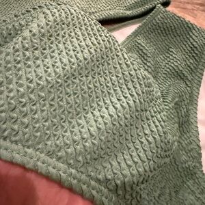 High waisted swim bottoms are flattering and oh so comfortable. Made from a gorgeous, crepe/crinkle textured fabric in a stunning green-ish shade, great for any skin tone.