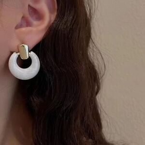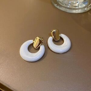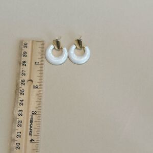 White enamel geo dangle stud earrings in gold tone hardware