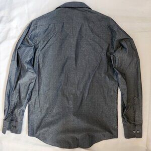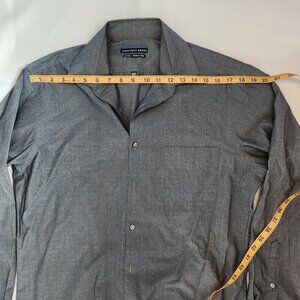 This button down dress shirt is gray with a small white dot. Fitted through chest and waist, wrinkle free fabric will look great all day. Measurements in pictures.