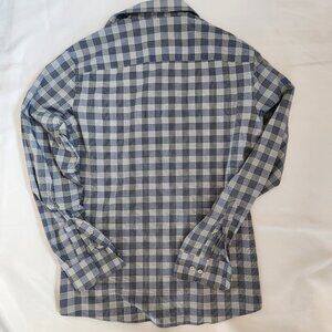 This is a cotton blend classic button down dress shirt from Geoffrey Beene in excellent like new condition. The shirt features a plaid pattern in white, gray and navy and has a slim fit through the shoulders, chest and waist. The material has a slight stretch to it, making this shirt perfectly comfortable for all day wear, while staying wrinkle free.