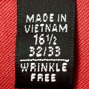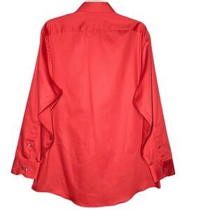 This tomato red fitted dress shirt has one breast pocket. It is made of a wrinkle free sateen cotton/polyester fabric. In excellent used condition.