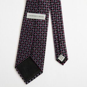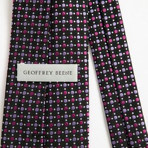 Men's Geoffrey Beene tie featuring a sharp black base with a vibrant pink, purple, and white polka dot pattern throughout. Made of 100% silk and hand-sewn, this elegant necktie adds a sophisticated pop of color to any formal or business outfit. Preowned in excellent condition with no visible flaws—well cared for and ready to wear. A perfect accessory for weddings, office attire, or formal occasions.