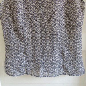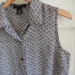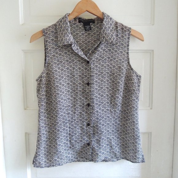 Geoffrey Beene Sport tan & black sleeveless top, size 8. Simple, flowy top is light tan with black semi-circle print design. Sleeveless and lightly fitted, with front and back seams. Collar, buttons down front with black buttons. Crisp, elegant, and professional, looks great under a blazer or with a black pencil skirt. EUC.
