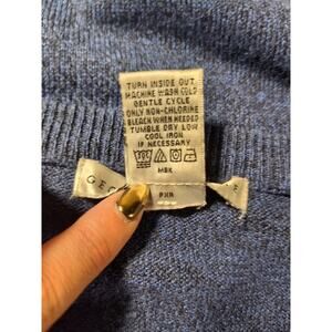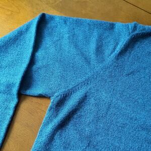 Men’s blue acrylic sweater by Geoffrey Beene featuring embroidered square pattern on the front shoulder.