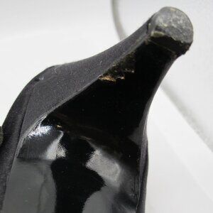 Perfect for any evening party! Geoffrey Beene black satin peep-toe 2 inch heel with silver fabric “button” and tassel detail. Uppers and foot bed are in excellent condition. There is a gouge on the inside of the left heel (not in the fabric) – see photo. The soles show wear and have a sole grip, a common practice of Mom. 8.5N
