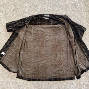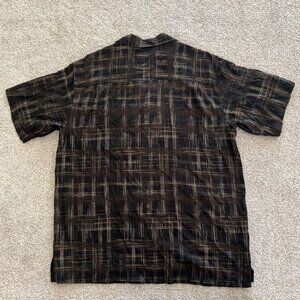 Geoffrey Beene washable silk crisscross plaid pattern black & brown button up